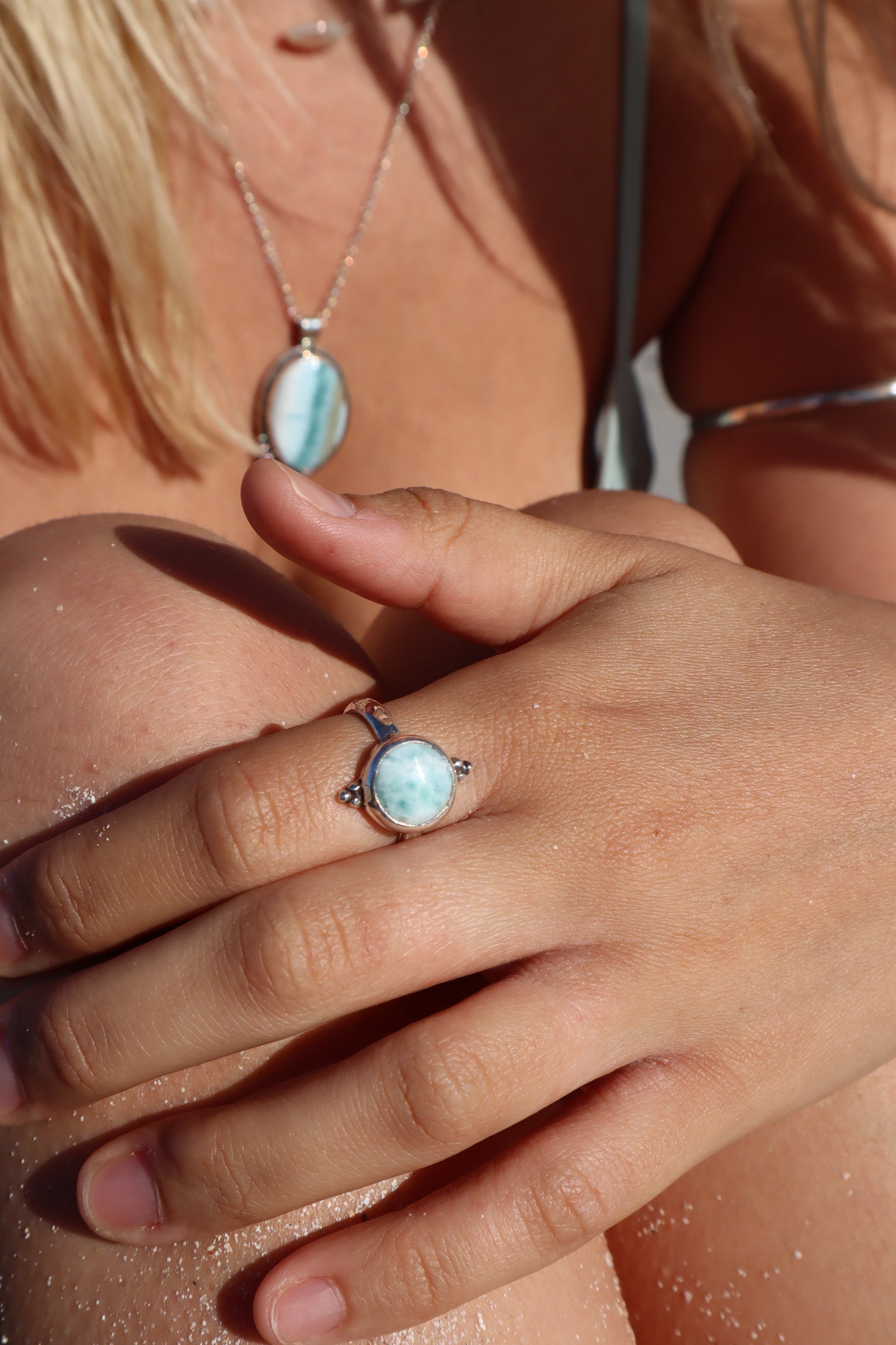 Handcrafted with 925 sterling silver and an beautiful Larimar stone. This ring features a textured ring band and added embellishments, creating the perfect everyday ring for ocean lovers.