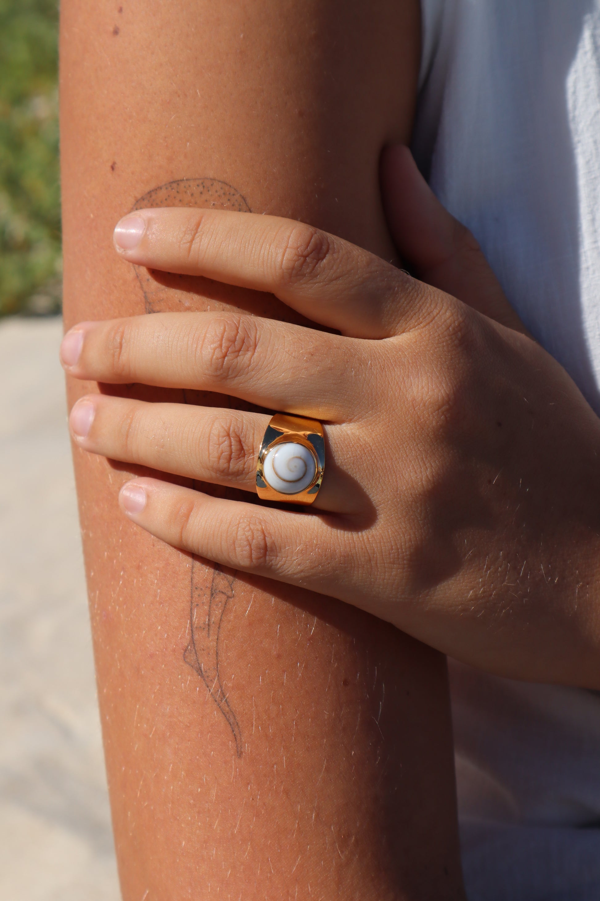 This ring features a beautiful Operculum shell set on a thick, chunky band.