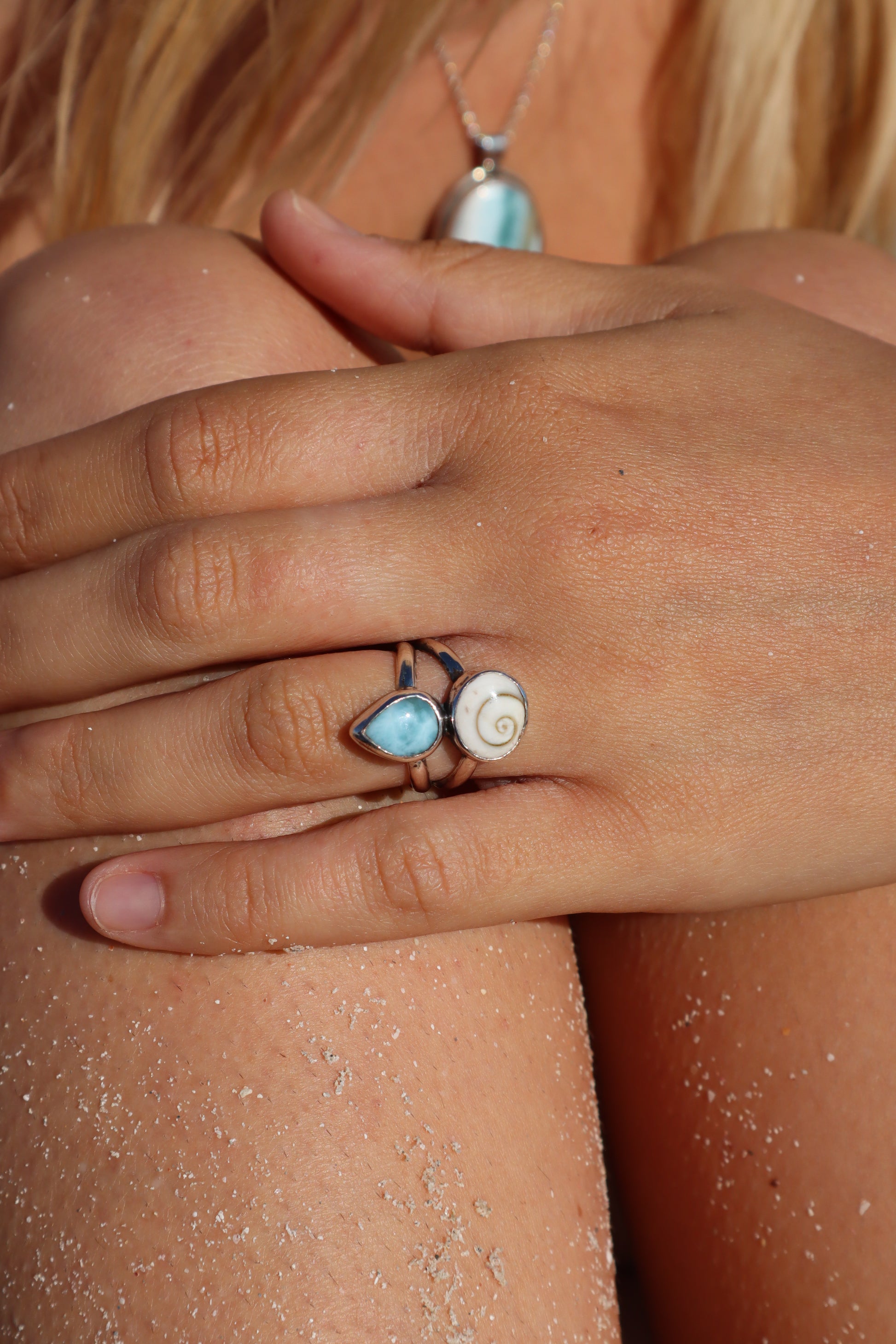 Handcrafted with 925 sterling silver and a beautiful operculum shell, paired with Larimar stone.