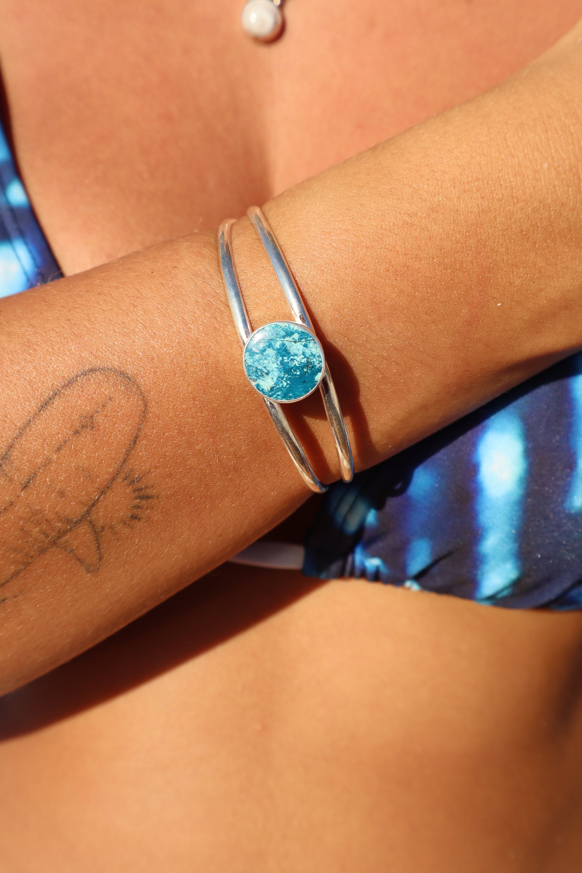 Handmade in 925 sterling silver, this double-banded cuff features a beautiful Shattukite Azurite stone on an open, adjustable band, allowing you to find the perfect fit.