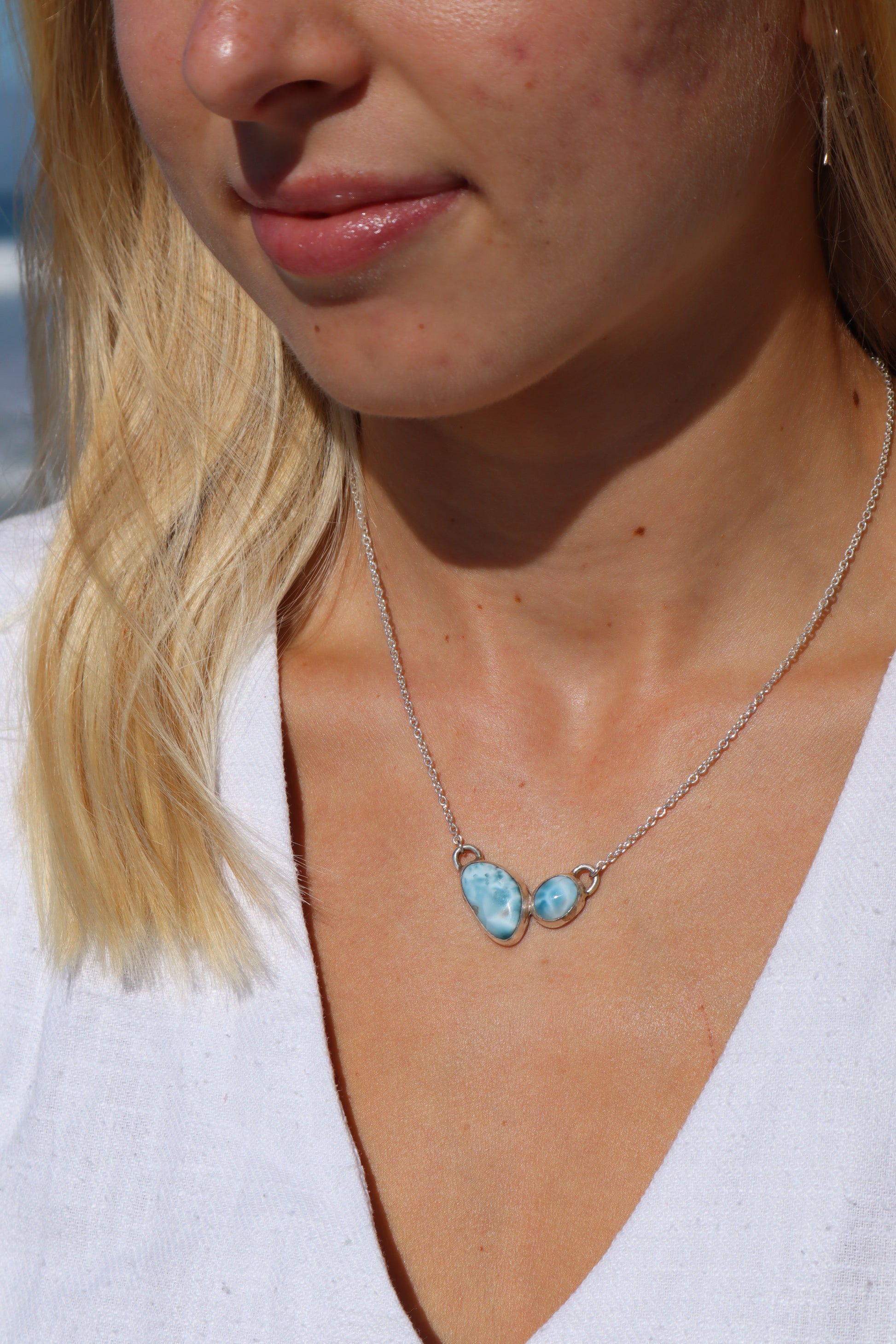 Handcrafted with 925 sterling silver, this beautiful necklace features 2 Larimar stones.