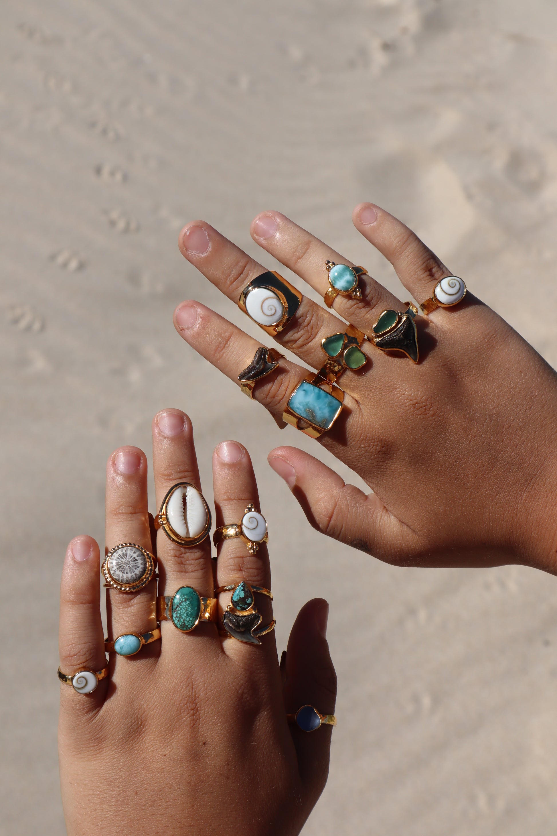 This ring features a gorgeous piece of fossilised coral and added floral-like embellishments, set on a double ring band, creating an intricate and durable ring.