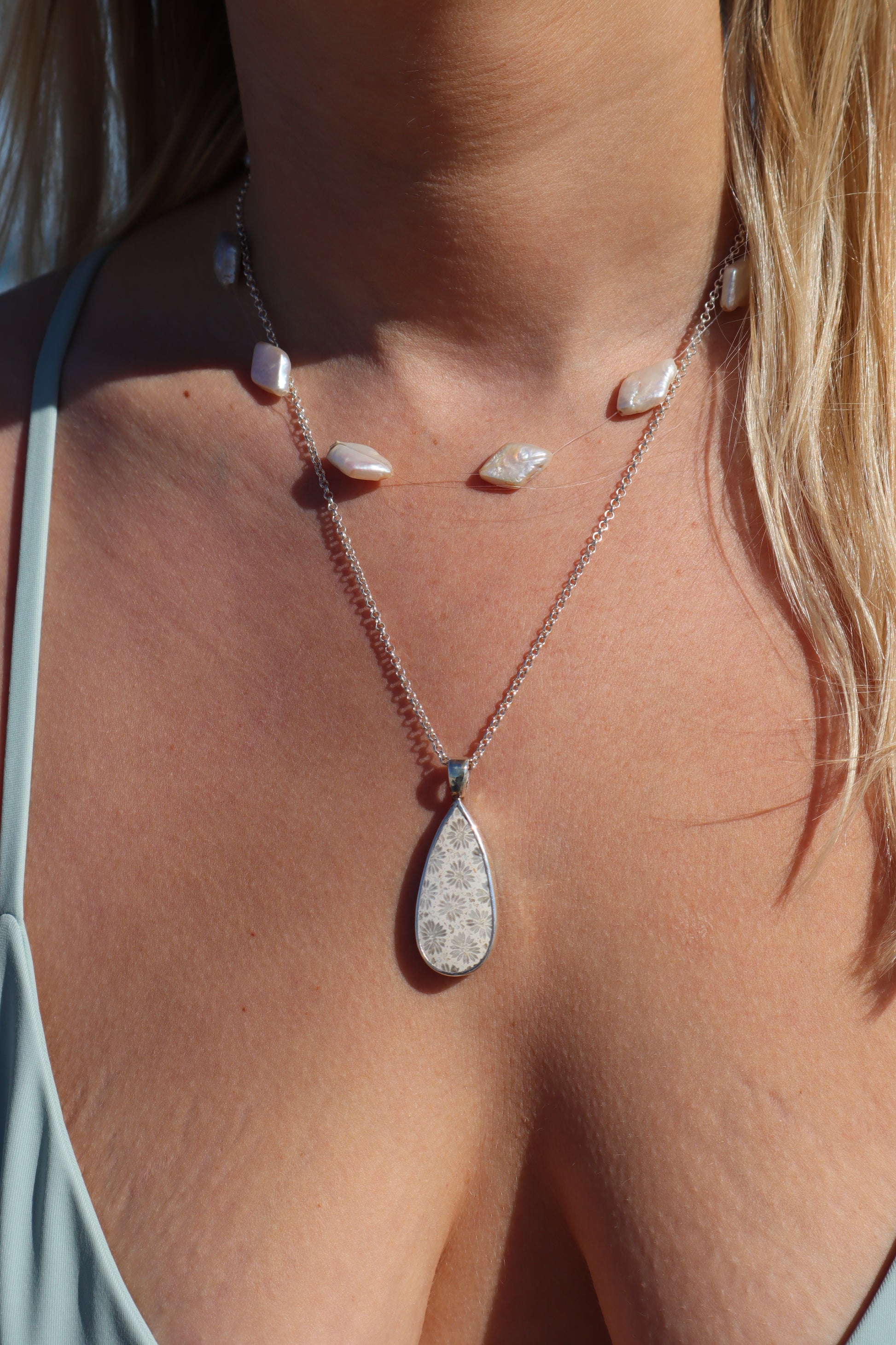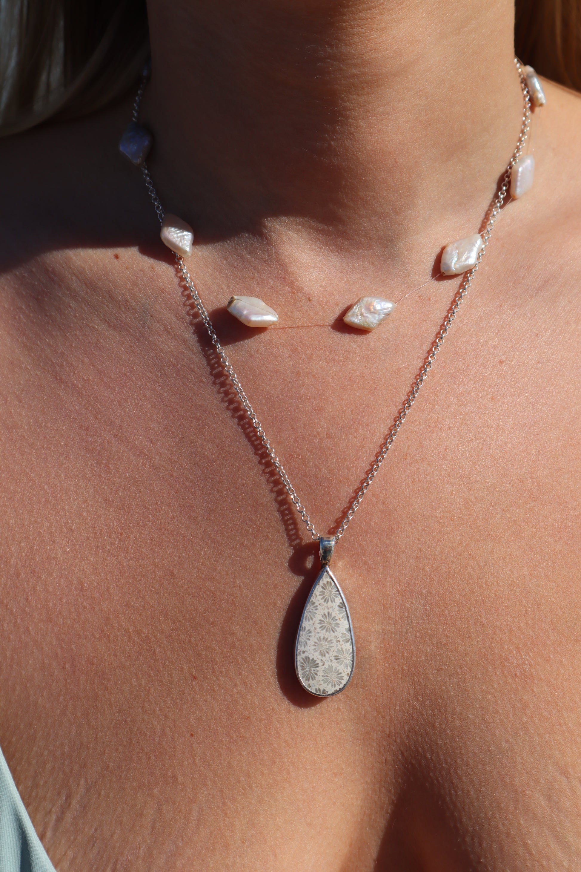 Handmade with 925 sterling silver. This pendant features a timeless piece of fossilised coral and a hand cut seahorse design on the back.