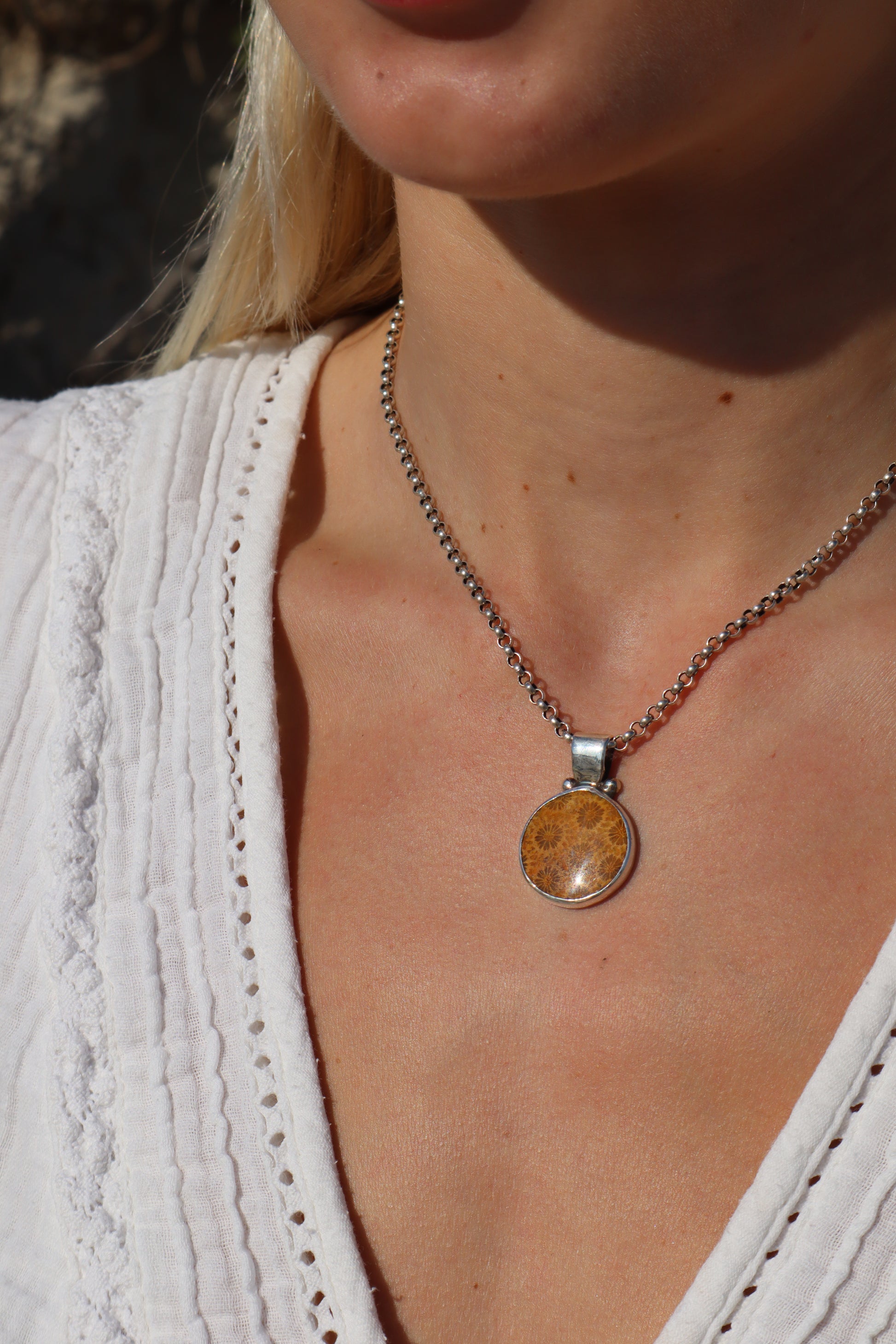 Handmade with sterling silver, this pendant features a timeless piece of fossilised coral.