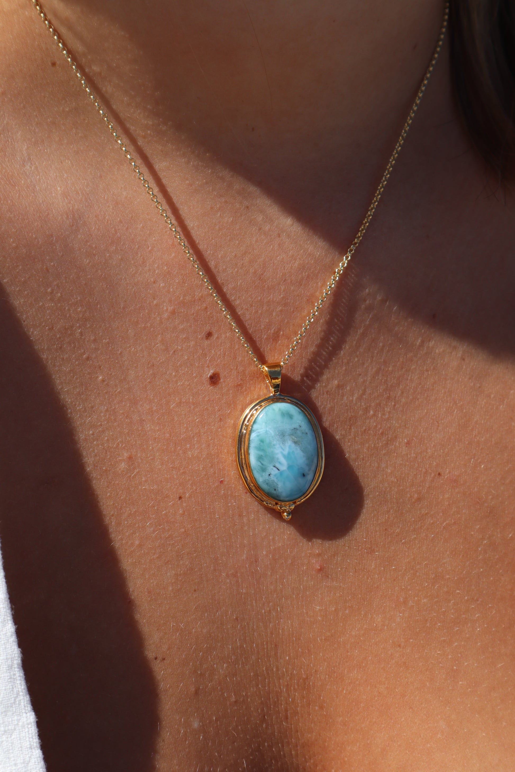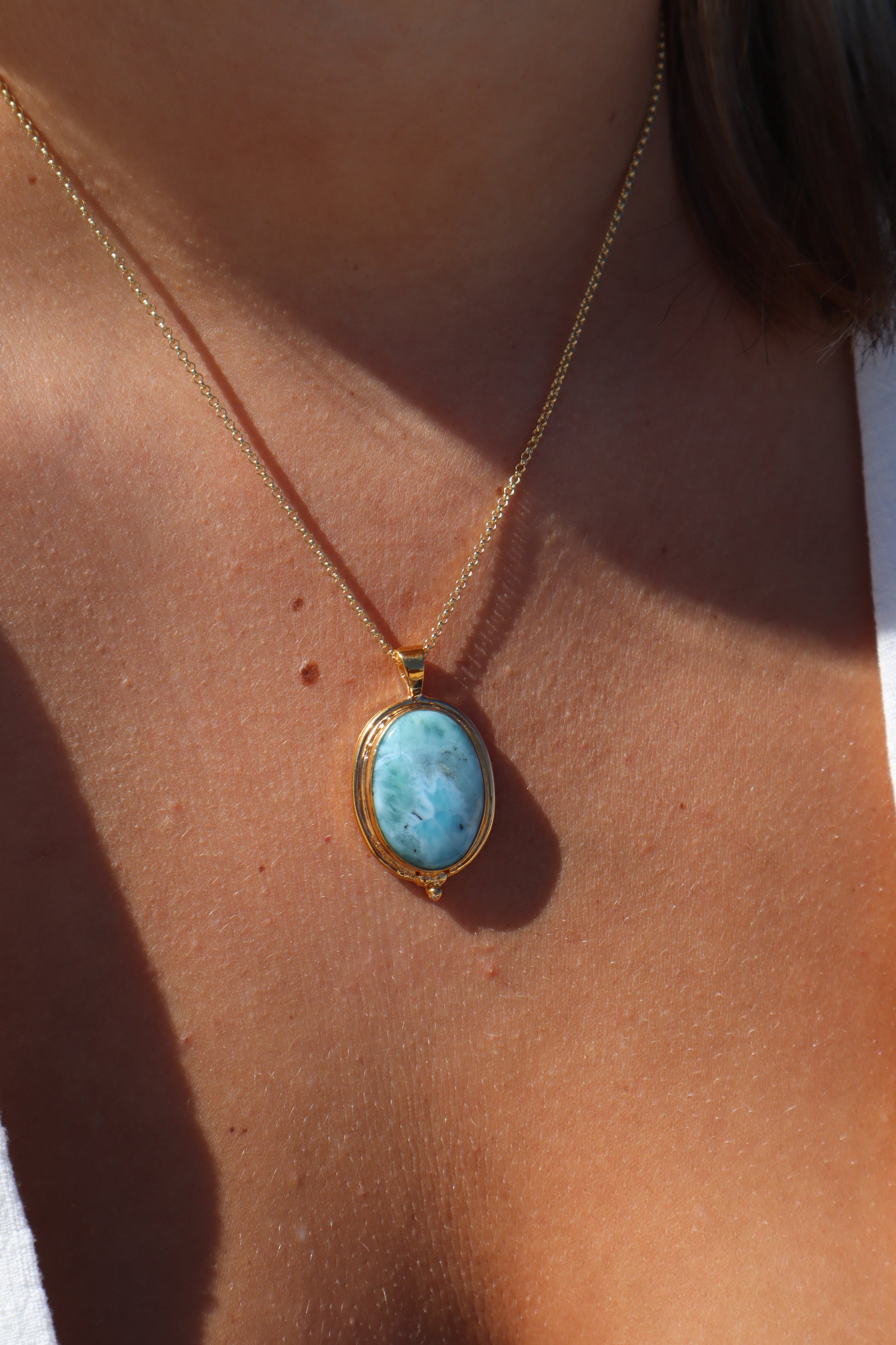 Handmade with 18k gold vermeil on a solid sterling silver base, this pendant features a beautiful Larimar stone that catches the eye.