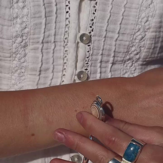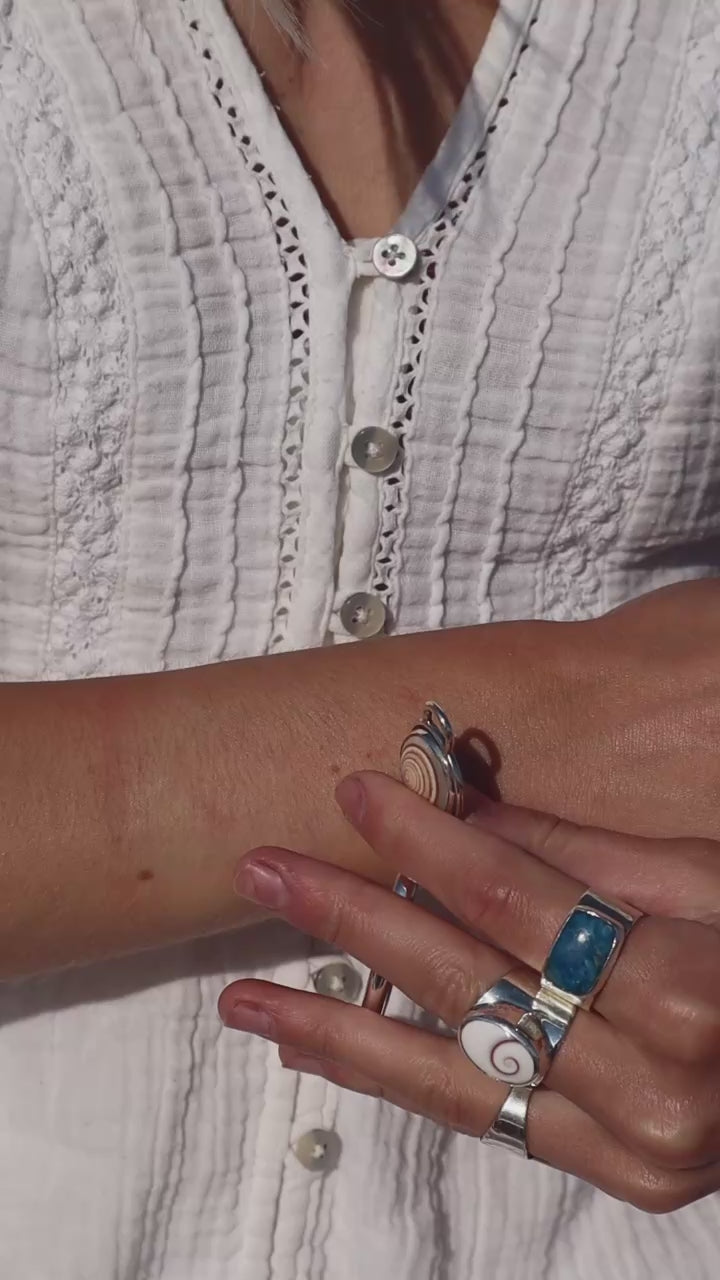 Handcrafted with sterling silver and a stunning spires, shell, this clasp bracelet features a hinge design for easy on-and-off wear. The secure closure ensures it stays in place, offering both convenience and lasting durability for a lifetime of wear.