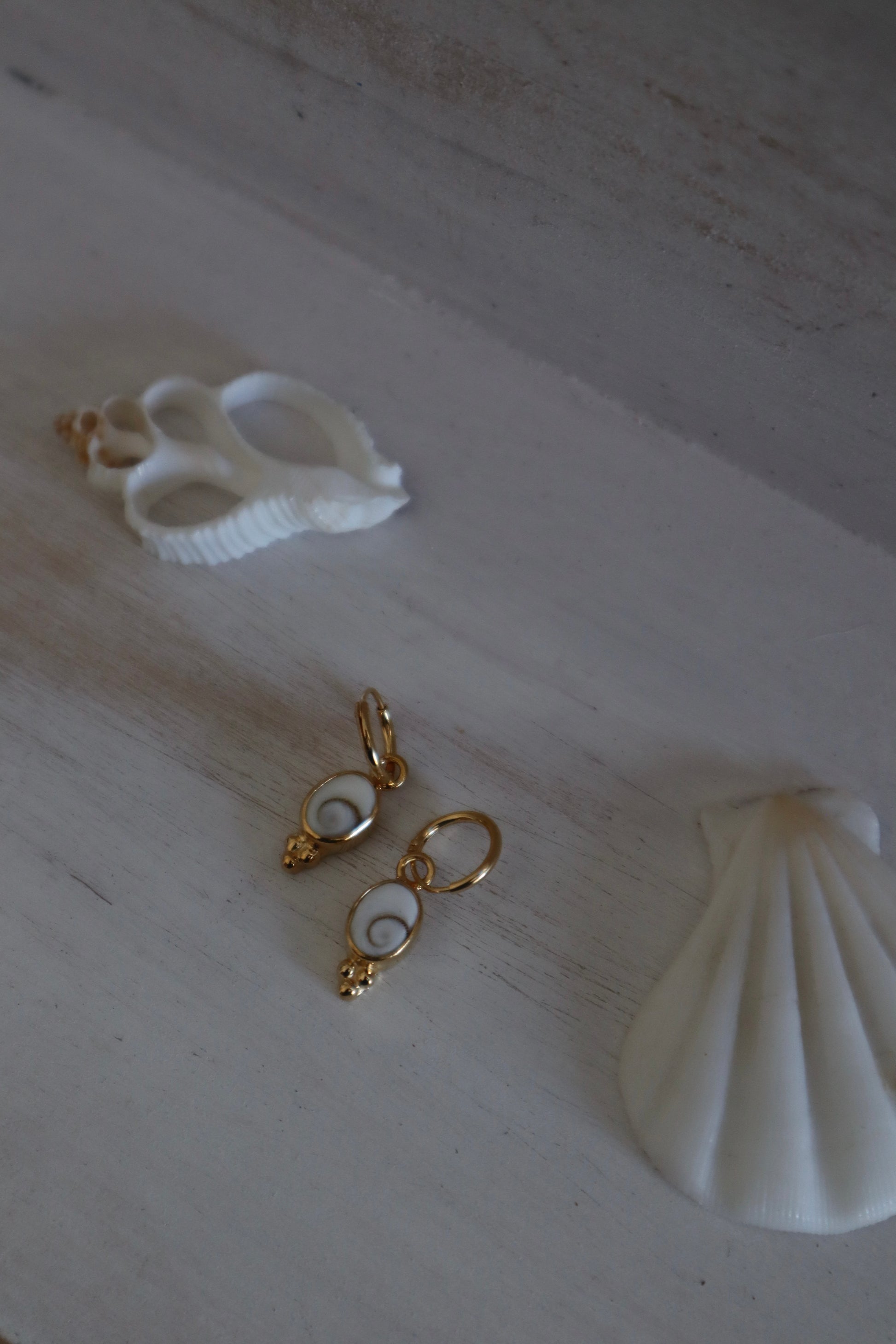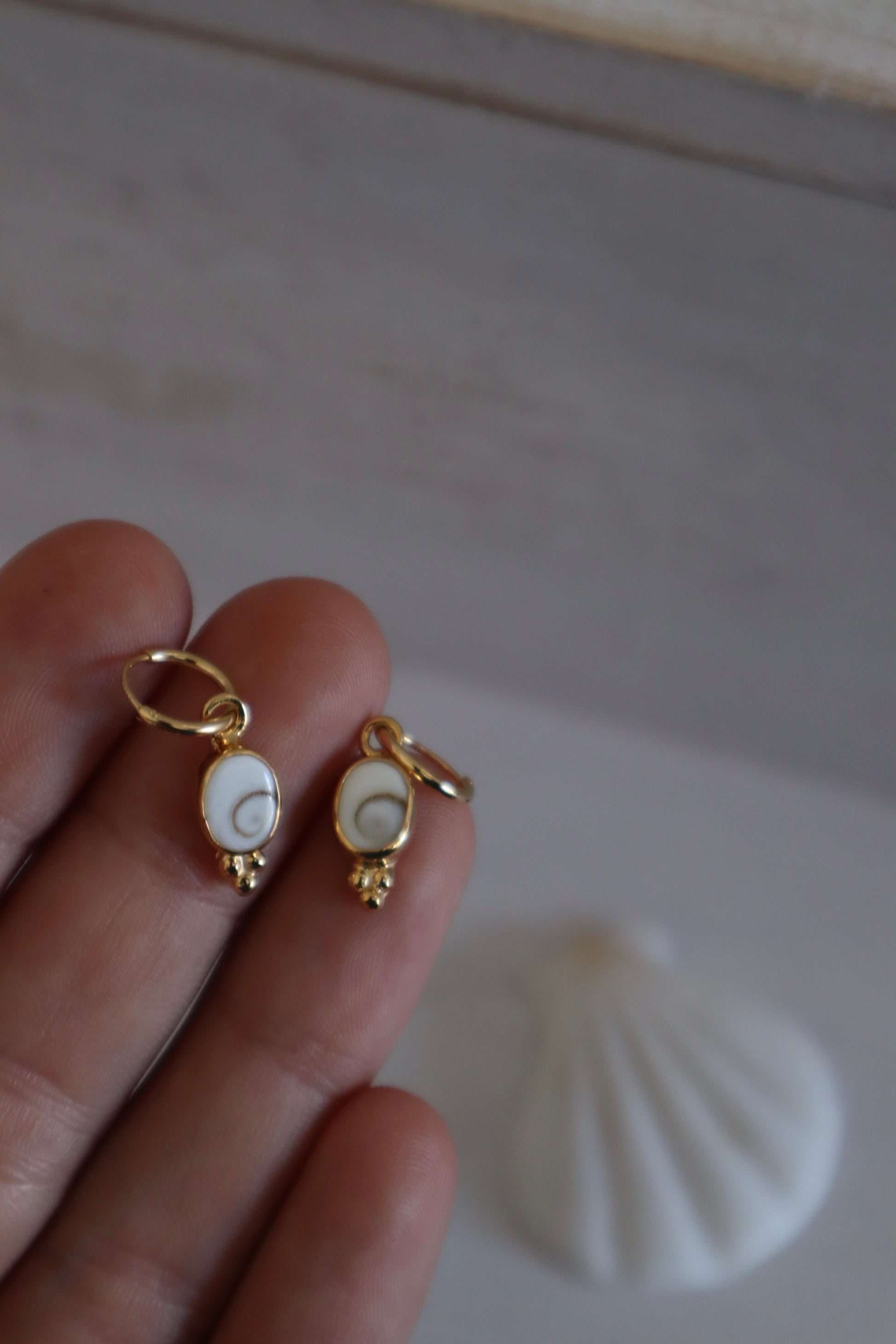 These earrings feature 2 beautiful operculum shells with added embellishments on small huggies.