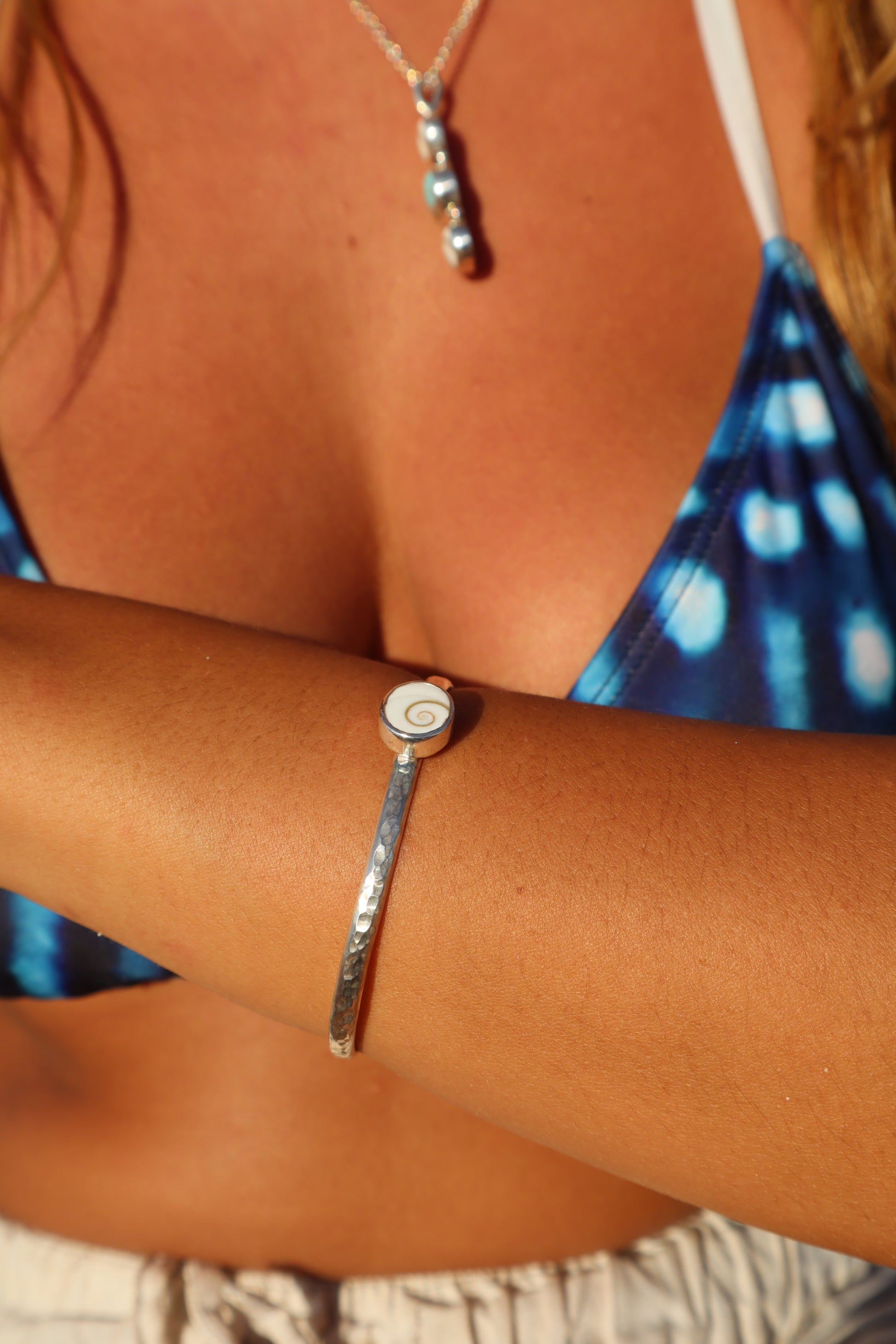 Handcrafted in 925 sterling silver with a beautiful operculum shell. This cuff has a hammered band finish, that shimmers effortlessly in the sun.