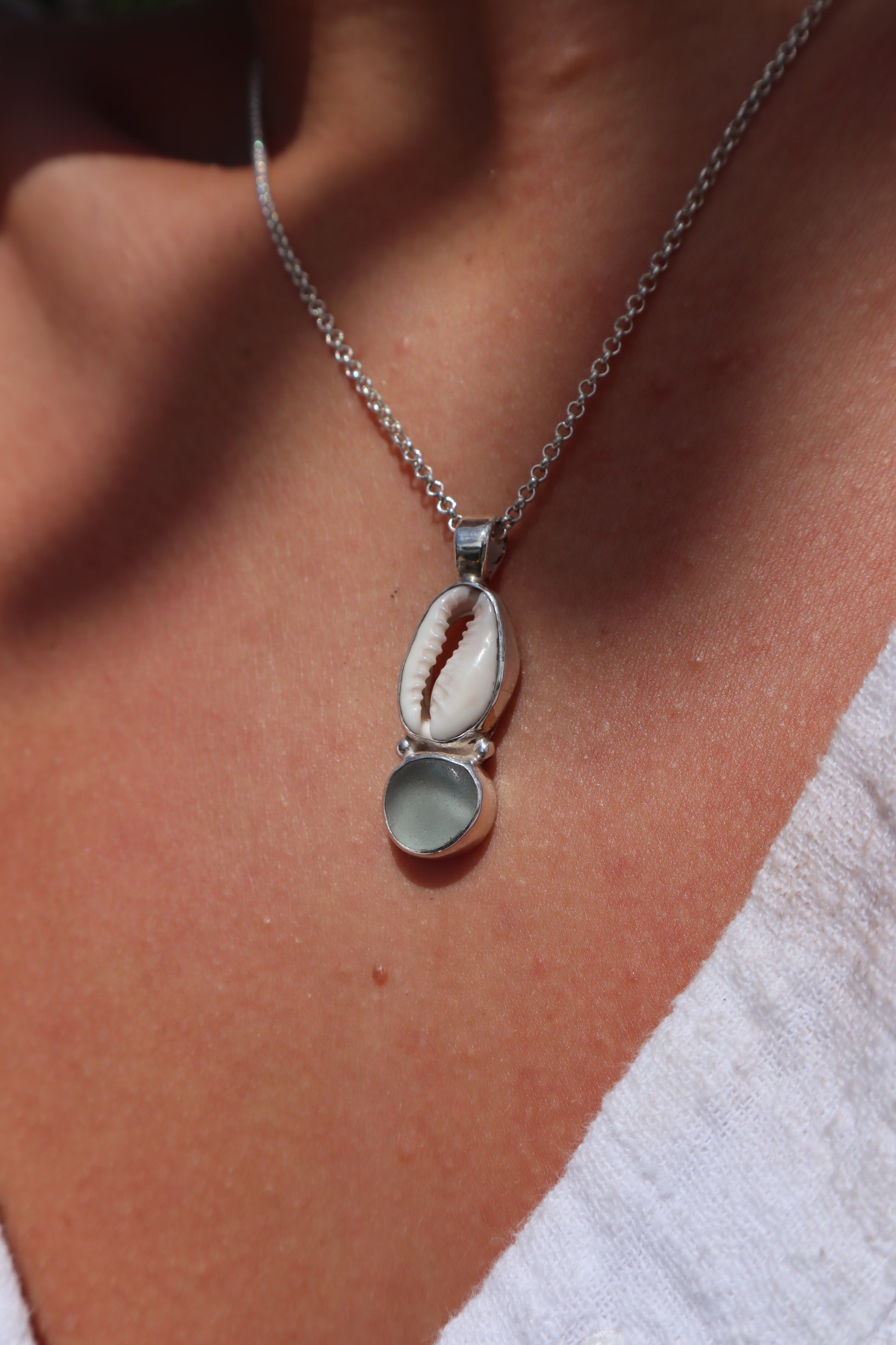 This handmade pendant features a piece of light blue Seaglass and a beautiful cowrie shell, set in 925 sterling silver.