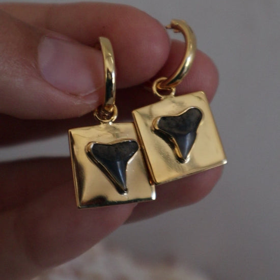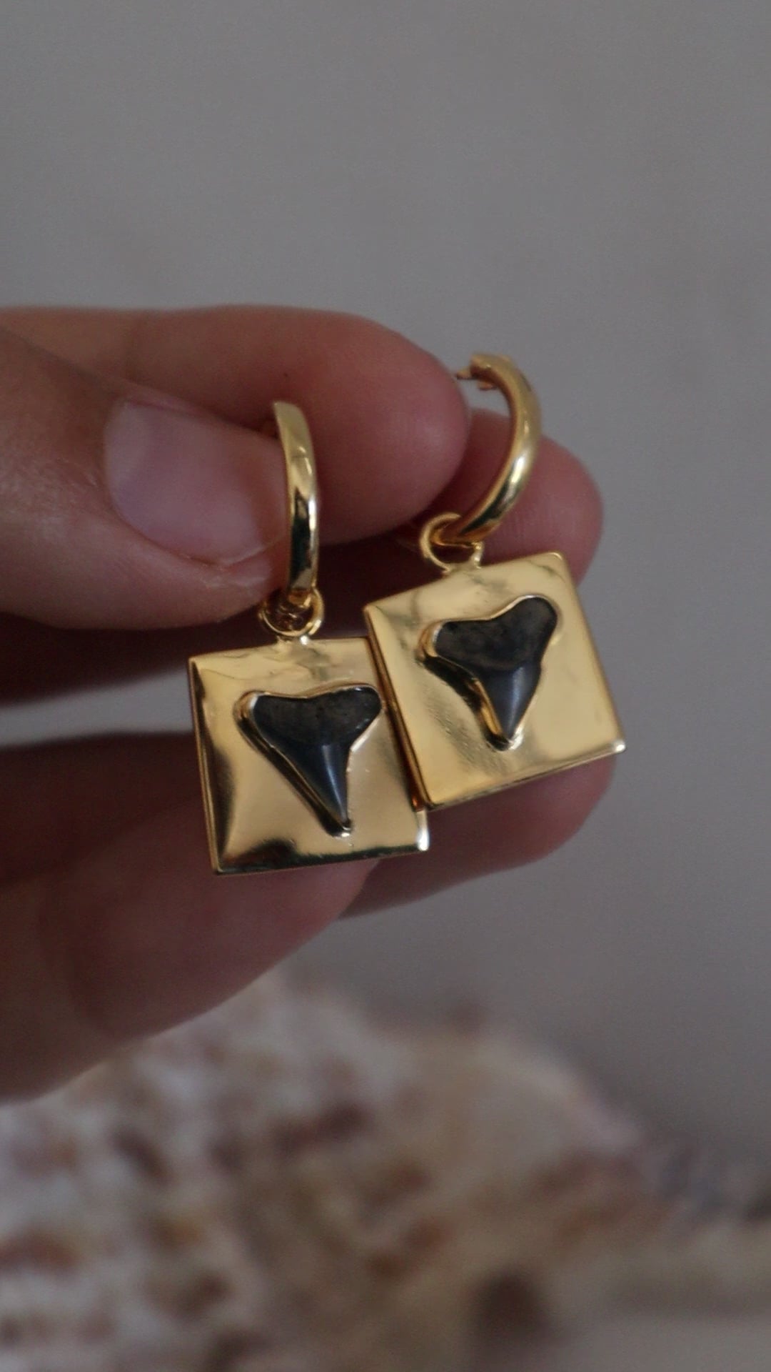 These earrings feature 2 fossilised shark teeth on a simple frame setting.