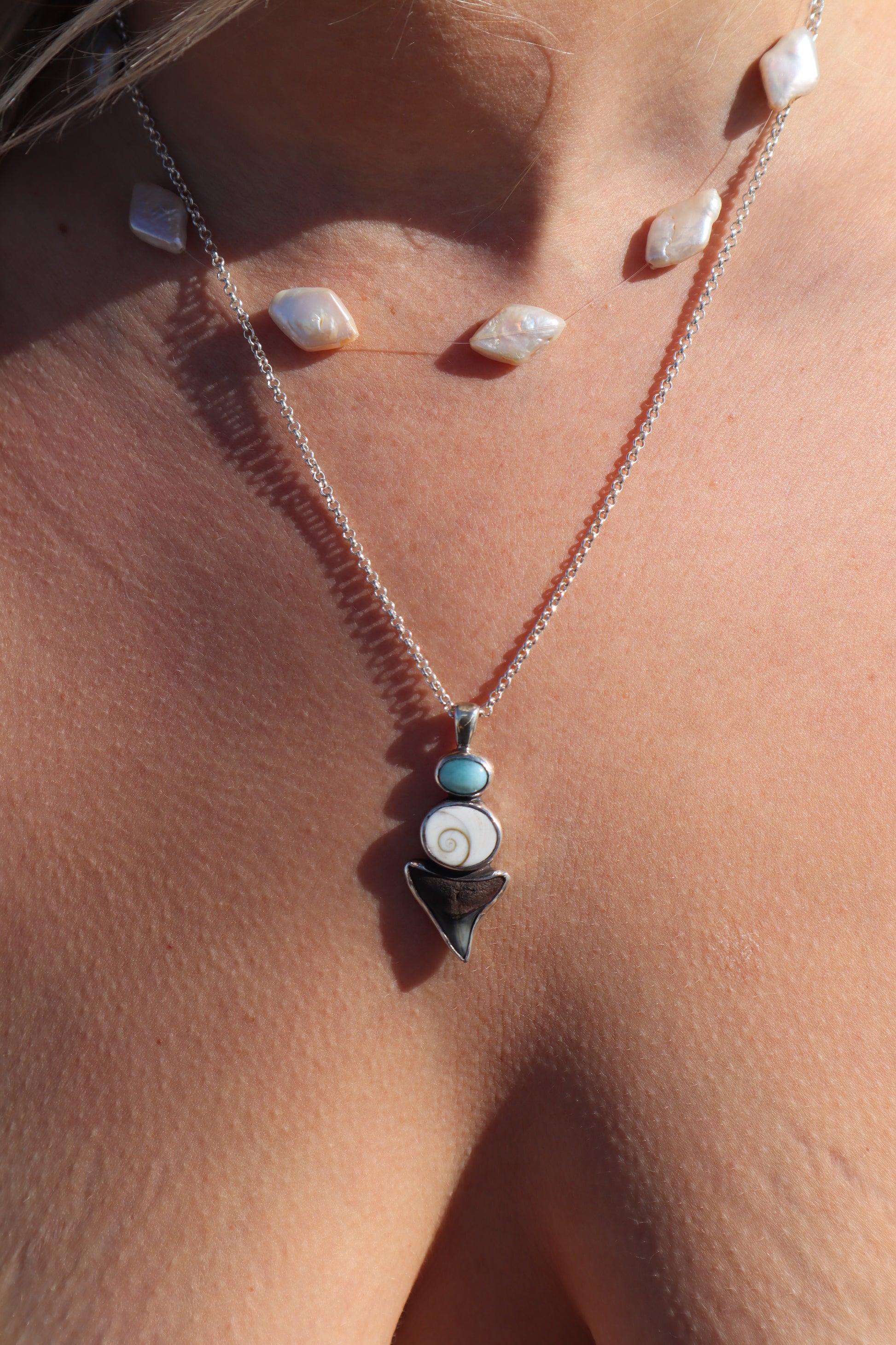 This pendant features an Operculum Shell, Larimar stone and a fossilised shark tooth.