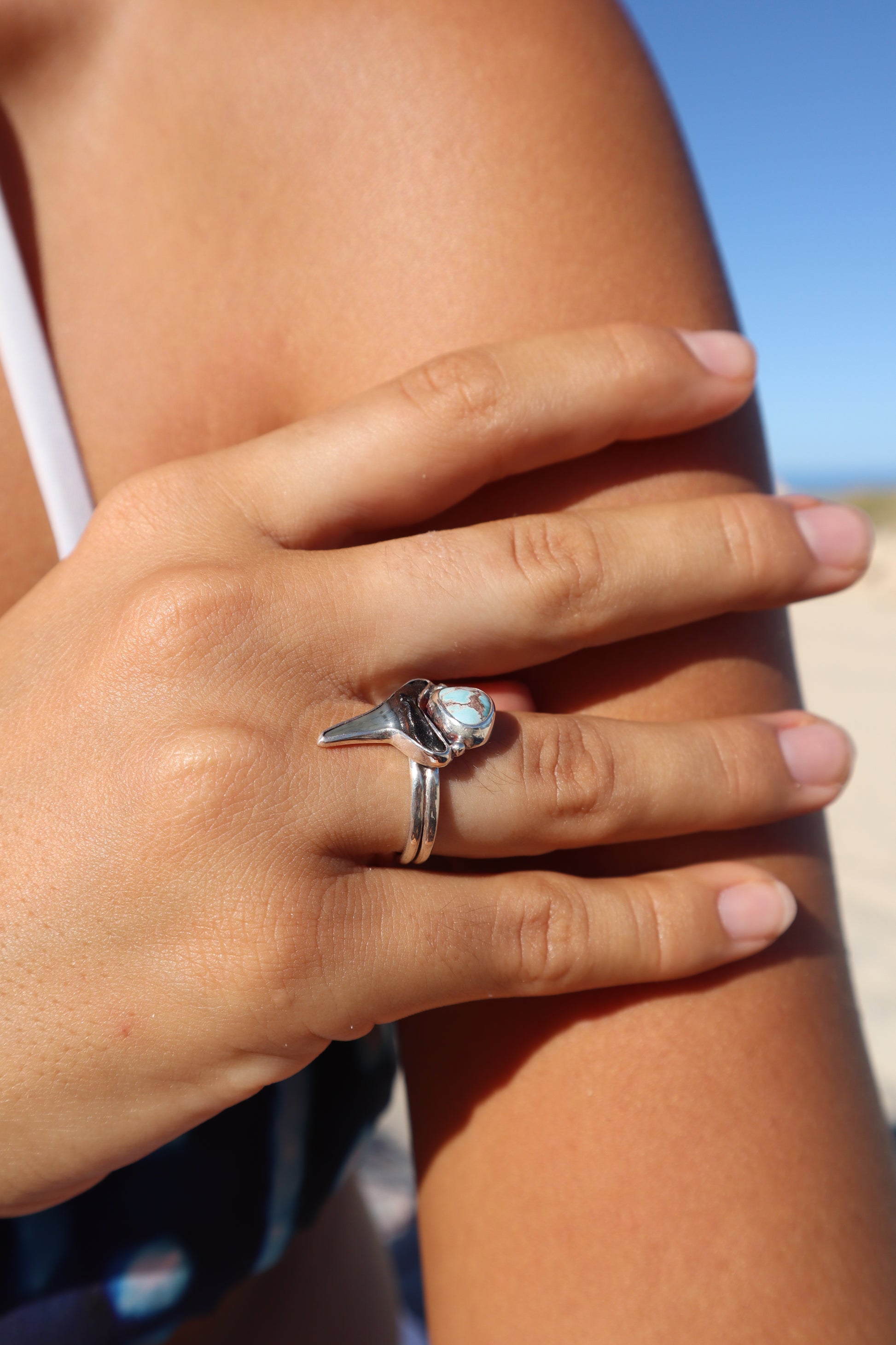 This ring features a Hubei Turquoise stone and a fossilised shark tooth, it has been handcrafted in 925 sterling silver with a double band, creating the perfect ocean lovers ring to be worn daily in the sun and sea.