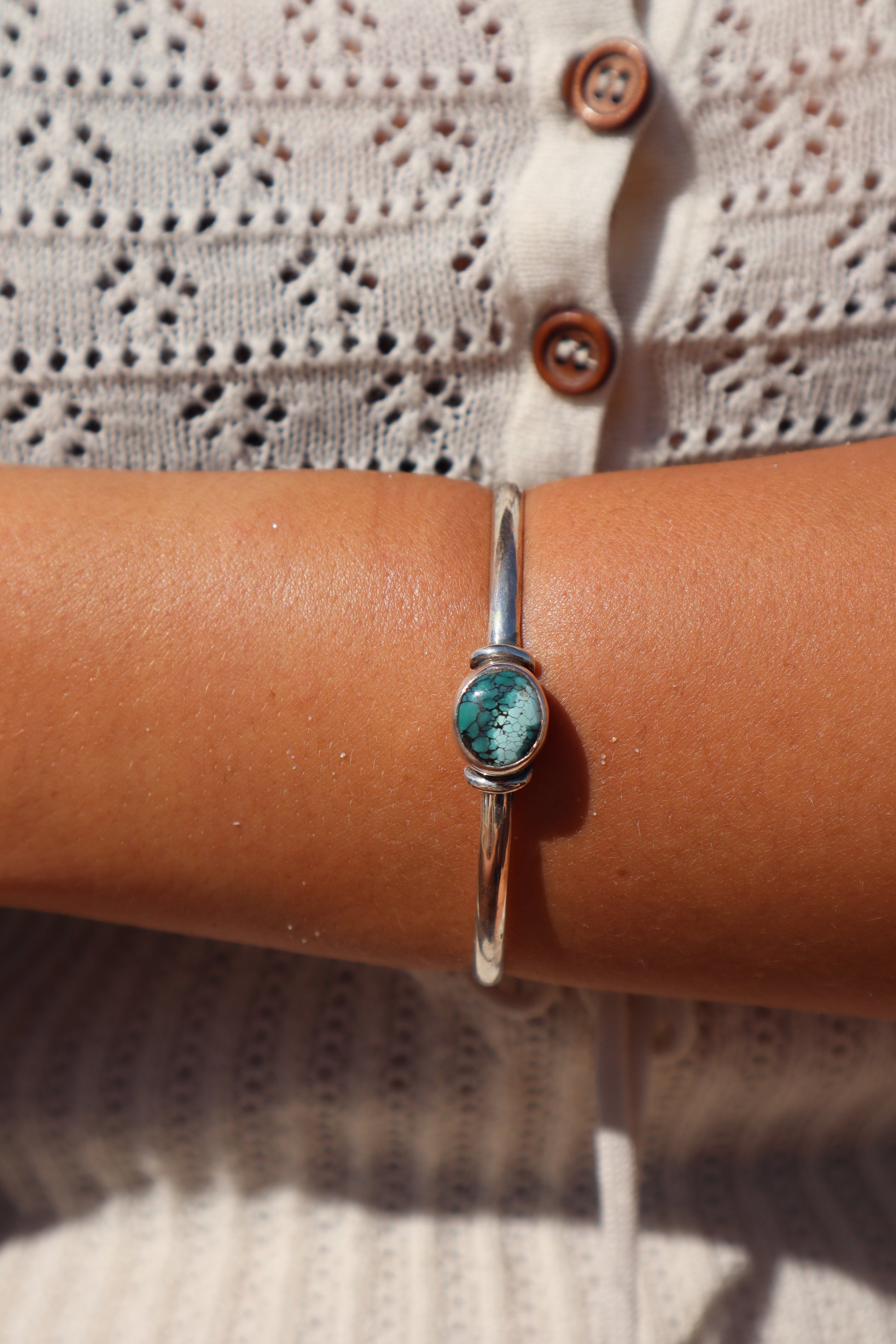 Handcrafted in 925 sterling silver, this cuff features a natural Hubei turquoise stone and chunky band designed for daily wear in the sun and sea.
