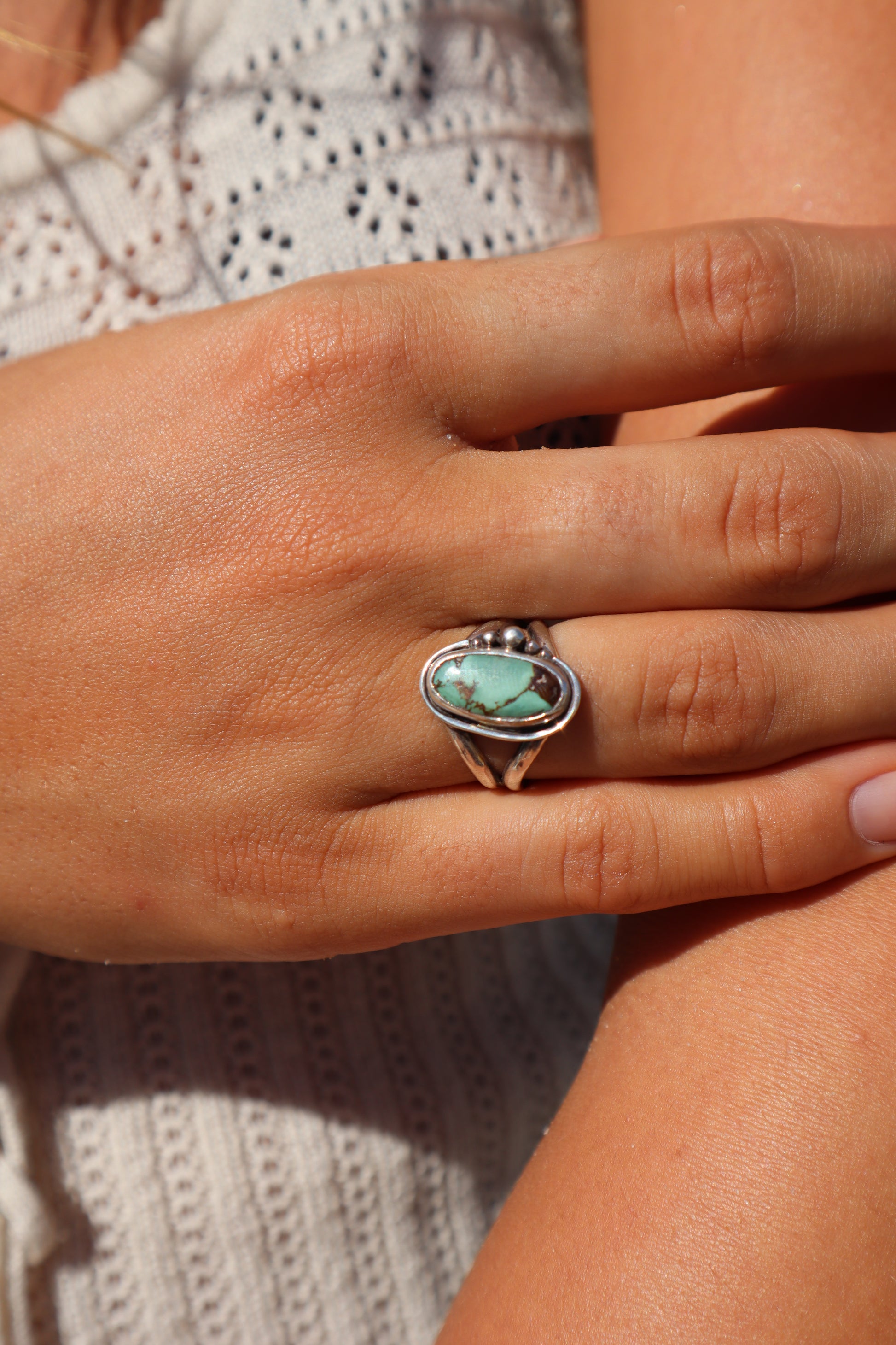 Handcrafted with 925 sterling silver and a beautiful Turquoise stone. This ring features added silver embellishments and a durable double band to last a lifetime in the sun and sea.