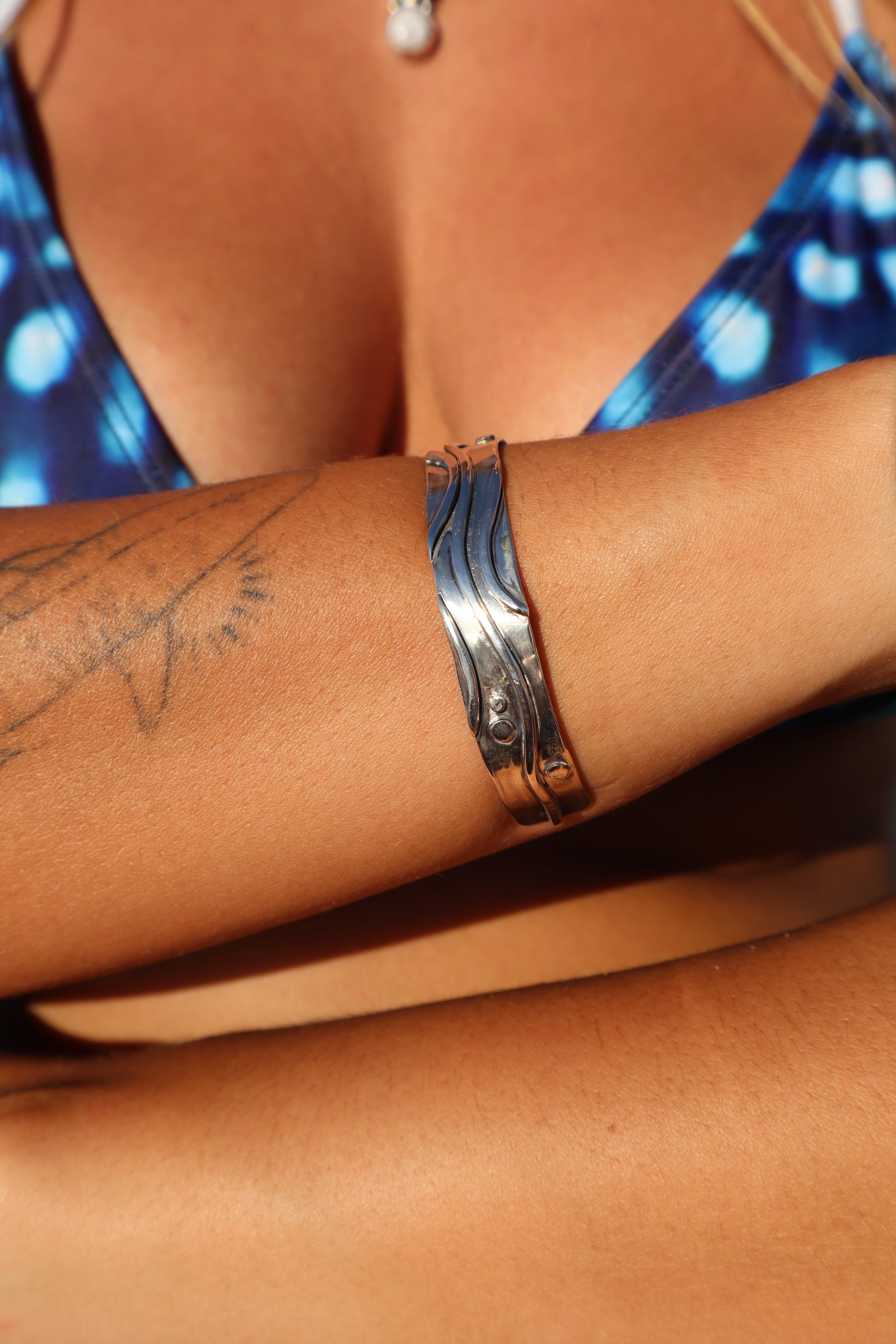 Handmade with 925 sterling silver, this gorgeous cuff has been hand shaped with wavy patterns resembling the ocean and it’s currents, creating a unique, intricate piece.